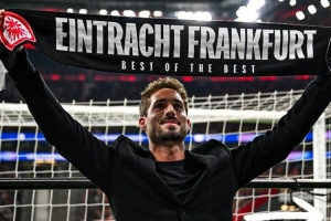 法蘭克福門(mén)將特拉普今夏轉(zhuǎn)會(huì)巴黎FC,法蘭克福本場(chǎng)比賽之前向前隊(duì)長(zhǎng)致敬,并與之告別,球員們?yōu)樗蜕狭藲g呼和掌聲。