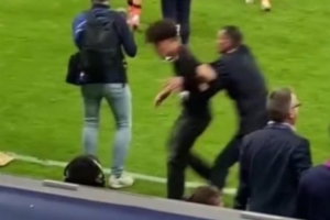 比賽結束后,獲得全場最佳獎項的拉什福德正配合拍照時,《太陽報》拍攝到兩名沖入球場的球迷被安保強制帶離。