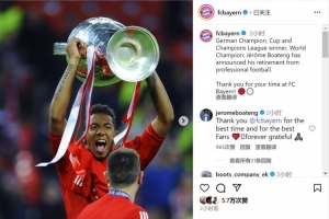 拜仁官方社媒曬出博阿滕效力球隊(duì)期間捧起歐冠獎杯的照片,并寫道:“德甲冠軍、德國杯冠軍、歐冠冠軍、世界冠軍,博阿滕已經(jīng)宣布退役。感謝你在拜仁的時光!”