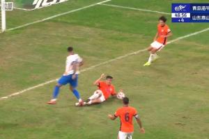 VAR沈寅豪介入,主裁判王迪看過回放后認(rèn)定劉軍帥手球犯規(guī),判給泰山點(diǎn)球。