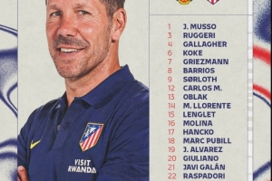 中場(chǎng):3-魯杰里、4-加拉格爾、6-科克、8-巴里奧斯、23-尼科-岡薩雷斯、7-格列茲曼、27-哈諾-蒙塞拉特、28-陶菲克