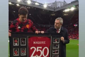 此役是馬奎爾為曼聯(lián)出戰(zhàn)的第250場比賽,B費(fèi)社媒曬出馬奎爾領(lǐng)取紀(jì)念球衣的視頻,配文:“重大成就,當(dāng)之無愧,大個子?!?/p>