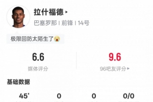 體育資訊9月22日訊 2025-26賽季西甲第5輪,巴薩3-0赫塔費(fèi)。拉什福德下半場(chǎng)替補(bǔ)出戰(zhàn),2次射正全場(chǎng)最多,傳球成功率93.8%,評(píng)分6.6。
