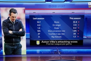 這是維拉本賽季5輪英超打進的唯一進球,BBC也盤點了維拉本賽季英超相較上賽季的場均進攻數據,可謂全面下滑,具體如下: