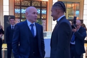 伊涅斯塔來到了在法國舉行的金球獎(jiǎng)?lì)C獎(jiǎng)典禮,并被拍到與巴薩球員拉菲尼亞在交談。