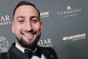 獲獎(jiǎng)后,多納魯馬非常開(kāi)心,手捧獎(jiǎng)杯自拍。曼城官方曬出這一照片,慶祝多納魯馬獲獎(jiǎng)。