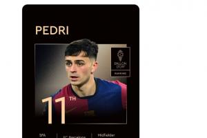 體育資訊09月23日訊 2025年金球獎獎項公布,巴薩中場佩德里排名第11,沒有進入前十。