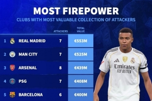 體育資訊9月23日訊 德國(guó)轉(zhuǎn)會(huì)市場(chǎng)統(tǒng)計(jì)了各家俱樂(lè)部一線隊(duì)鋒線球員的身價(jià),并列出鋒線總價(jià)榜單,皇馬5.53億歐居首,曼城、阿森納二三位。