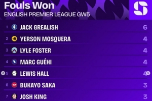 體育資訊9月24日訊 英超第5輪戰(zhàn)罷,squawkafootball列各項(xiàng)數(shù)據(jù)排行,格拉利什是本輪造對(duì)手犯規(guī)次數(shù)最多的球員,共有6次。