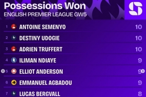 體育資訊9月24日訊 英超第5輪戰(zhàn)罷,squawkafootball列各項數(shù)據(jù)排行,塞梅尼奧、烏多吉、特呂費爾是本輪奪回球權次數(shù)最多的球員,各有10次。