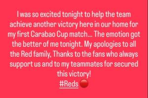 賽后,?;倏嗽谏缑较蚶锲智蛎缘狼福骸敖裢砟苁状螀⒓勇?lián)賽杯主場賽事并幫助球隊(duì)再奪勝利,我無比激動……但今夜情緒確實(shí)有些失控。在此向所有紅軍大家庭致歉,也感謝一直支持我們的球迷,以及攜手贏下比賽的隊(duì)友們!”