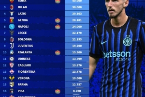 2025-26意甲俱樂(lè)部季票銷售排名: