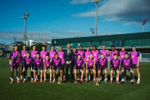在體育城訓(xùn)練場(chǎng)上,巴薩女足球員們與俱樂(lè)部官員哈維爾-普伊一起合影,身旁擺放著三項(xiàng)重要獎(jiǎng)杯:邦馬蒂連續(xù)第三次獲得金球獎(jiǎng)、維姬-洛佩茲贏得首屆科帕獎(jiǎng)以及埃瓦-帕喬爾榮獲首個(gè)蓋德-穆勒獎(jiǎng)。