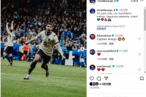 阿勞霍社媒曬照慶祝取勝,他寫道:“又邁出一步,懷著謙遜與努力。我們繼續(xù)前進(jìn),巴薩球迷們!”
