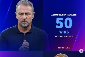 自執(zhí)教巴薩以來,弗里克已經(jīng)帶隊進(jìn)行了67場比賽,取得50勝8平9負(fù)的戰(zhàn)績,接近執(zhí)教拜仁63場50勝的數(shù)據(jù)。