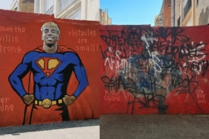 在原本的畫作中,亞馬爾被描繪成超人形象,胸前的S換成了L,并配有“當(dāng)意志堅(jiān)定時(shí),障礙微不足道”的標(biāo)語。不幸的是,位于埃斯科里亞爾街的作品現(xiàn)在幾乎完全被黑色和白色顏料覆蓋。