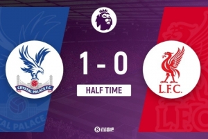 傷停補時10分鐘。上半場比賽結束,水晶宮1-0利物浦。