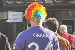 曼聯(lián)本輪英超不敵布倫特福德,記者Samuel Luckhurst曬出一位球迷身穿奧納納球迷的照片,這位球迷還戴了一頂小丑的假發(fā),該記者調(diào)侃道:可以肯定的是,這個(gè)小伙子不是奧納納的最大球迷。