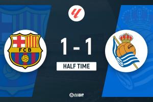 上半場(chǎng)傷停補(bǔ)時(shí)2分鐘,半場(chǎng)結(jié)束,巴薩暫1-1皇家社會(huì)。