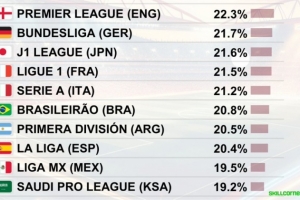15公里/小時(shí))各聯(lián)賽高速跑動(dòng)距離占比TOP10:1、英超:22.3%2、德甲:21.7%3" />