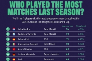 體育資訊9月29日訊 FIFPRO統(tǒng)計(jì)了上賽季球員出場(chǎng)排行,莫德里奇共出場(chǎng)76次居首,共4376分鐘。