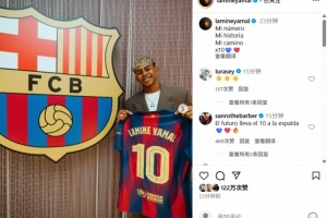 亞馬爾曬出自己手持10號球衣與巴薩隊(duì)徽的合影,并配文:我的號碼、我的故事、我的方式x10????