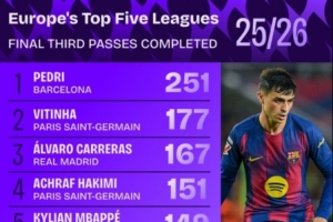 體育資訊10月1日訊 數(shù)據(jù)網(wǎng)站Squawka統(tǒng)計(jì)本賽季五大聯(lián)賽進(jìn)攻三區(qū)完成傳球數(shù),巴薩中場(chǎng)佩德里斷檔領(lǐng)先,皇馬4人進(jìn)入前十。