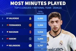 體育資訊7月17日訊 德國轉(zhuǎn)會市場統(tǒng)計了五大聯(lián)賽球員上賽季俱樂部+國家隊的出場時間,并列出榜單,巴爾韋德居首,B費、邁尼昂二三位。
