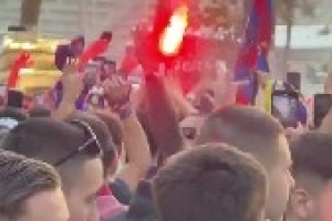 賽前,巴薩球迷在球場(chǎng)外聚集,高喊辱罵巴黎的口號(hào)。