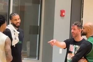 訓(xùn)練間隙,塔圖姆與懷特和新援安芬尼-西蒙斯互相聊天。