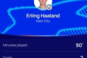 哈蘭德在本場比賽首發(fā)出戰(zhàn),4射門3射正,打進(jìn)2球,評分8.8全場最高。