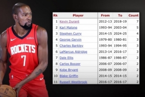 杜蘭特在休斯敦對陣火箭季后賽?共砍下7次?30+,為歷史最多(共7場)。