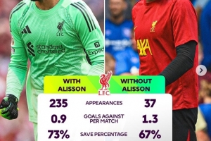 由于阿利森受傷,瑪瑪達什維利很可能在本場臨危受命。英超官方也盤點了阿利森此前登場與否對于利物浦的影響,具體如下: