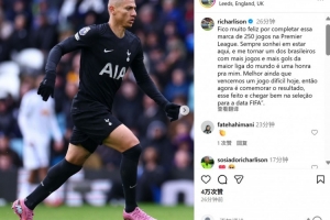體育資訊10月4日訊 在本輪英超,熱刺2-1擊敗利茲聯(lián),理查利森替補(bǔ)登場完成英超第250次出場。