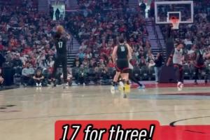 GIF-開(kāi)拓者球迷嘉年華隊(duì)內(nèi)表演賽,楊瀚森和夏普手遞手配合,后者接球漂移三分落袋
