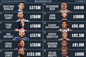 體育資訊10月6日訊 今天,美媒BoardRoom轉(zhuǎn)載了世界范圍內(nèi)收入(工資+代言)最高的運(yùn)動(dòng)員排名,這份榜單最早發(fā)布于今年5月。
