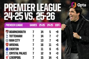 附英超球隊(duì)較上賽季同期拿分情況: