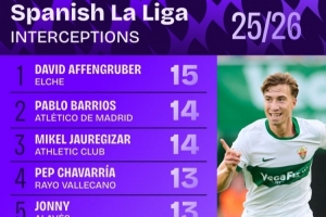 體育資訊10月7日訊 日前,Squawka統(tǒng)計(jì)了本賽季西甲攔截次數(shù)排行,巴里奧斯14次并列第2,瓊阿梅尼12次并列第6。