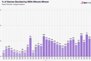 據(jù)統(tǒng)計(jì),此占比數(shù)據(jù)是此前英超任何一個(gè)賽季的兩倍,此前最高的是23/24賽季,占比7.1%;上賽季90分鐘后打進(jìn)制勝球的比賽占比為5.8%。