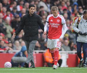 本輪英超阿森納2-0西漢姆聯(lián),厄德高上半場(chǎng)第19分鐘與對(duì)手膝對(duì)膝碰撞,隨后繼續(xù)在場(chǎng)上堅(jiān)持了10分鐘后被傷退離場(chǎng)。