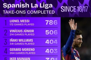 體育資訊10月10日訊 Squawka統(tǒng)計(jì)了2016-2017賽季以來(lái)球員在西甲的成功過(guò)人次數(shù),并列出榜單,梅西786次居首,維尼修斯506次第二。