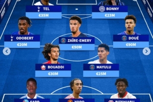 中場(chǎng):布阿迪(里爾,3000萬(wàn)歐)、馬尤盧(巴黎,5000萬(wàn)歐)、奧多貝爾(熱刺,2000萬(wàn)歐)、扎伊爾-埃梅里(巴黎,5000萬(wàn)歐)、杜埃(巴黎,9000萬(wàn)歐)