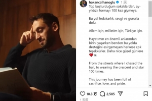 恰爾汗奧盧達(dá)成國(guó)家隊(duì)出戰(zhàn)100場(chǎng)里程碑,他在社交媒體上寫(xiě)道:“從在街頭追逐足球,到身披星月戰(zhàn)袍(土耳其隊(duì)球衣)出戰(zhàn)百場(chǎng)。這段旅程充滿了犧牲、熱愛(ài)與驕傲。為我的家人,為我的祖國(guó),為土耳其?!?/p>