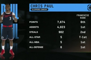 在快船效力期間,保羅共得到7674分(隊(duì)史第6),送出4023次助攻(隊(duì)史第1),完成902次搶斷(隊(duì)史第2),5次入選全明星(并列隊(duì)史第1),5次入選最佳陣容(隊(duì)史第1),6次入選最佳防守陣容(隊(duì)史第1)