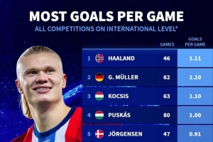 體育資訊10月13日訊 德國轉會市場統(tǒng)計了足壇歷史球員在國家隊的場均進球數量,并列出榜單,哈蘭德1.11球居首,蓋德-穆勒、柯奇士次席。
