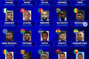 以下為非洲各國歷史身價(jià)最高球員具體身價(jià)情況: