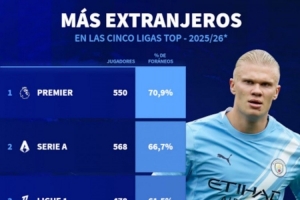 本賽季五大聯(lián)賽外籍球員占比