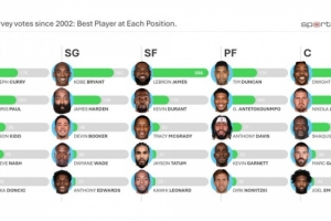 體育資訊10月14日訊 今日,NBA數(shù)據(jù)專家Todd Whitehead統(tǒng)計(jì)了自從2002年以來聯(lián)盟總經(jīng)理調(diào)查投票對(duì)于“各個(gè)位置最佳球員”的得票最多球員。