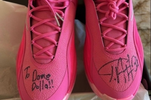 字母哥給利拉德的是他最新發(fā)布的簽名鞋F(xiàn)reak 7,字母哥也貼心的簽上了“to簽”,寫了利拉德的外號“Dame Dolla”。