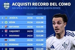 體育資訊7月18日訊 德國轉(zhuǎn)會(huì)市場盤點(diǎn)了科莫隊(duì)史引援排行,今年夏天已花費(fèi)超過1億歐。